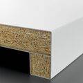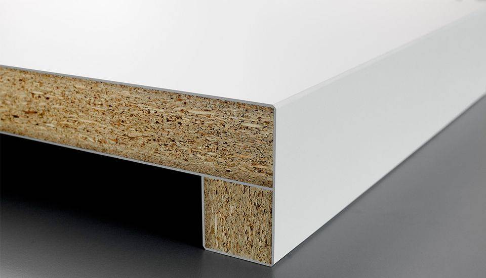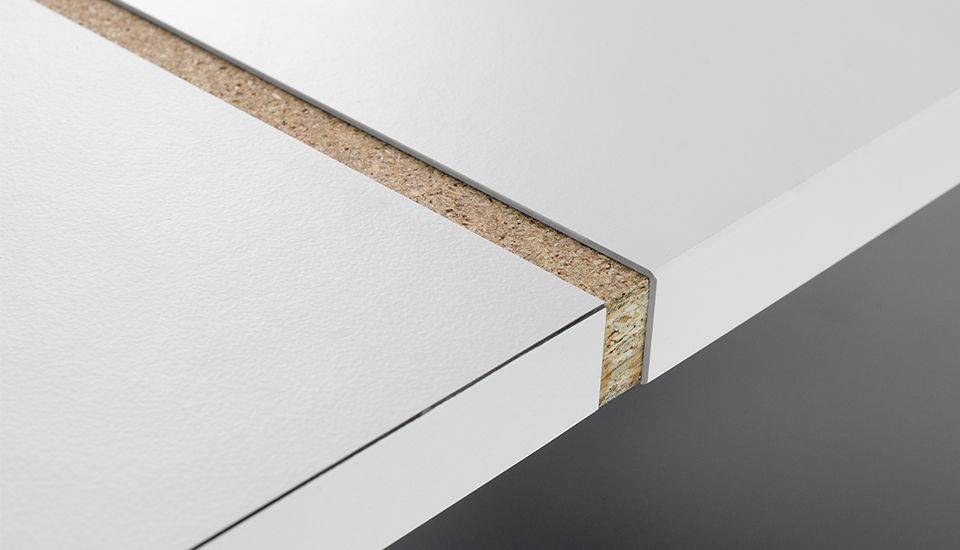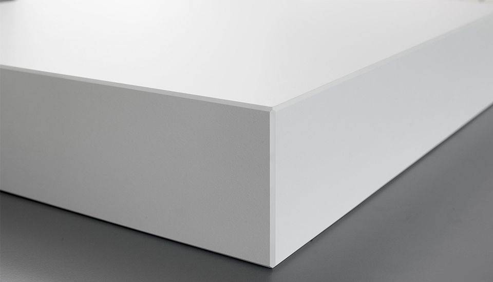 Ob für Arbeitsflächen, Tische oder Regale – überall dort, wo die fugenlose Verarbeitung im Vordergrund steht, eignet sich der durchgefärbte HPL-Schichtstoff optimal. Der Grund dafür liegt in der homogenen Farbigkeit des Materials: Im Gegensatz zu herkömmlichen HPL-Beschichtungen wird UniColor ausschließlich mit klarem Melaminharz imprägnierten Papieren hergestellt, wodurch das Material seine homogene Farbigkeit erhält. Dadurch bringt der Schichtstoff neue Möglichkeiten bei der Gestaltung mit sich – was sich besonders bei der Kantenbearbeitung zeigt: Durch das Fasen der Kante lässt sich beispielsweise ein fließender Übergang in die Fläche herstellen und es entsteht eine kantige, fugenlose Optik. So lassen sich Kanten und Flächen einheitlich gestalten, ohne sichtbare Nahtstellen zu hinterlassen.